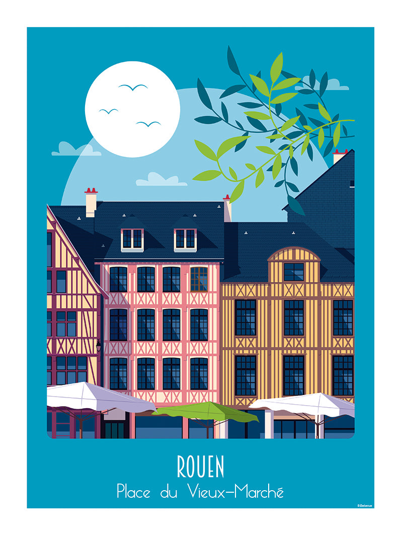 Raphaël Delerue est un illustrateur basé en Normandie. Formé aux écoles Saint-Luc de Tournai et ERG de Bruxelles, il travaille pour la publicité, l’édition, la presse et le web. Il est reconnu pour ses affiches touristiques au style rétro inspiré des années 50-60. Son univers mêle lignes claires, couleurs vives et paysages régionaux français. Il collabore aussi avec des éditeurs comme Hachette ou Ouest-France.