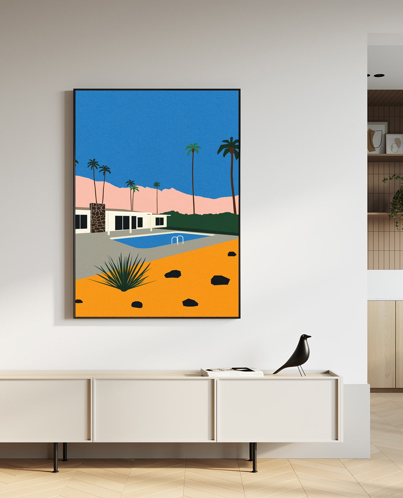 German artist Rosi Feist studied Media Art & Design at the Bauhaus University Weimar. Most of his projects were developed under the guidance of Professor Christine Hill, a New York/Berlin artist, at the Chair of Media, Trend & Public Appearance. Many of his motifs are inspired by photographs taken by his wife during their trips to the USA. These photos often feature scenes from abandoned motels, desert cacti, secluded service stations, and everyday objects that are brought into the spotlight, showcasing the beauty in the ordinary and forgotten. Rosi Feist has a deep affection for the trivial; he finds inspiration in the simplest things, like a garden chair or a rubbish bin. His artistic approach focuses on reducing his subjects to simple areas, often using beautiful pastel colors combined in different layers, allowing him to transform the mundane into visually captivating works of art.